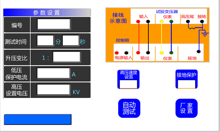 1、按照主界面(如图3)选择耐压试验。按接线原理图连接好引线,并将变压器和控制箱可靠接地,控制箱的接地端必须接到变压器的接地端,请勿直接接地线,防止控制箱接地而变压器没有良好接地。